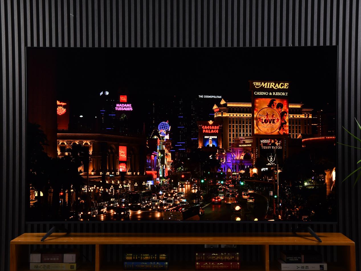 而双向23 bit则大幅提升背光控制和混合控光能力,通过超10亿级的背光黑白明暗的精细控制,可以让背光本身就能够呈现播放画面的轮廓,通过更精细的控光,让画面每一个像素点的亮度呈现都更加精准细腻。通过实测画面我们可以感受到,画面中暗部区域深邃如墨,静谧而富有层次感,丝毫没有普通电视常见的灰雾感;亮部则耀眼夺目,灯光等元素的高光部分明亮且不失真。