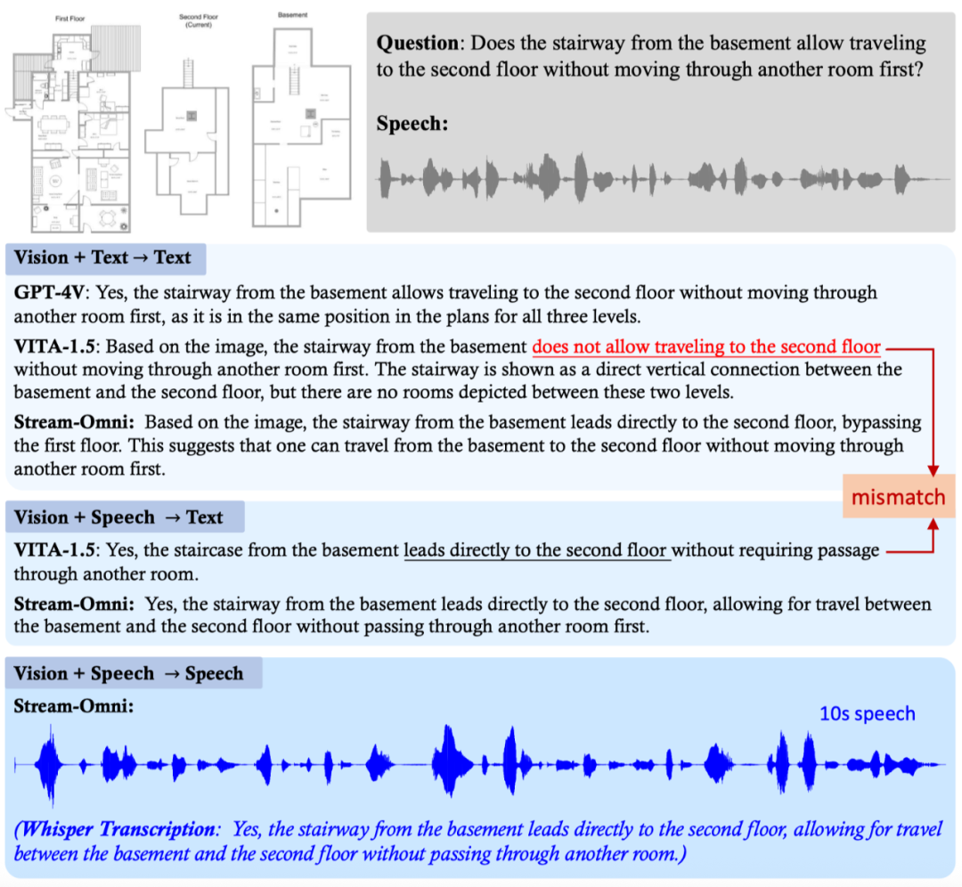 层级维度映射使得Stream-Omni 在语音交互过程中还能同步输出中间文本结果(即指令和回复的转录文本),为用户提供更全面的多模态体验。