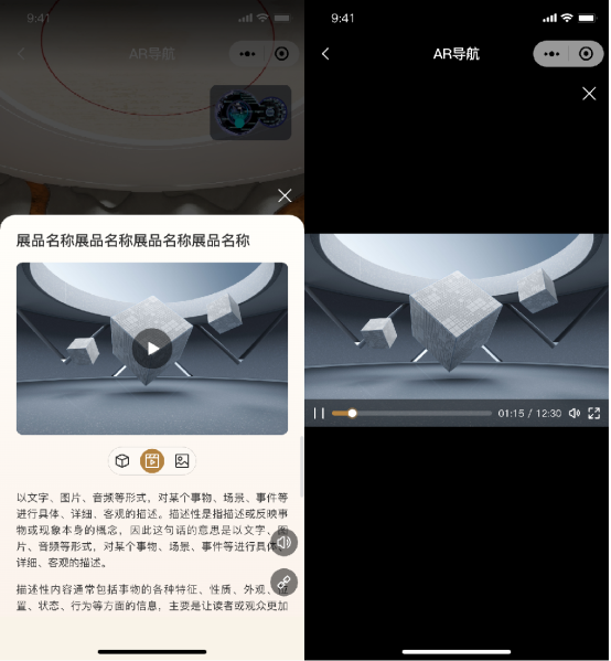 对于用户而言,只需要打开AR导航系统,选择想要导航的地点/场景,打开手机摄像头进行扫描识别定位,然后选择导航终点,即可开启AR可视化导航。用户在手机端可以看到3D导览箭头,只需跟着屏幕内箭头指示、画面提醒走即可。对于导航线路中,需要特定展示的隐藏内容(如展品/商品),在导航的过程中,当手机摄像头扫描到特定内容时也可以一键解锁隐藏内容。