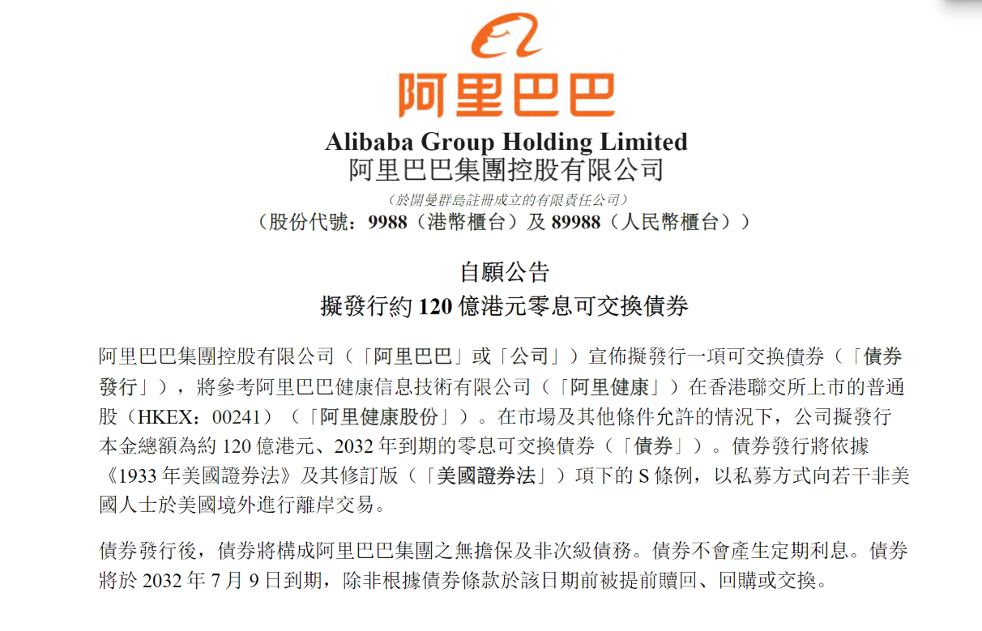 阿里释放又一则大消息。7月3日,阿里巴巴集团发布公告,计划发行本金总额约120亿港元、2032年到期的零息可交换债券。《节点财经》获悉,本次募集资金净额将用于投入云计算基础设施建设和支持国际电商业务发展。简单理解,阿里将发行价值120亿的债券,用于云计算和国际电商两大业务。问题来了,第一,为什么在此时发售高达120亿规模的可交换债券?第二,为什么是云计算?第三,又为什么是国际电商?为什么此时发售高达120亿的可交换债券?120亿港元的发行规模,在今年发售可交换债券的企业中,绝对位居行业前列。根据阿里的公告,债券的初始交换比率为每1,000,000港元本金额的债券可交换约160,513.6股阿里健康股份,相当于每股阿里健康股份的初始交换价格为6.23港元。基于初始交换价格,并假设债券被全数交换为阿里健康股份,债券的初始交换财产将代表阿里健康截至2025年5月31日不超过约12%的已发行股本。作为阿里在大健康领域的旗舰平台,阿里健康主营医药电商、医疗健康服务等业务。2025财年,阿里健康实现调整后净利润额为19.50亿元,同比增长35.6%,调整后净利润率从5.3%提升至6.4%。