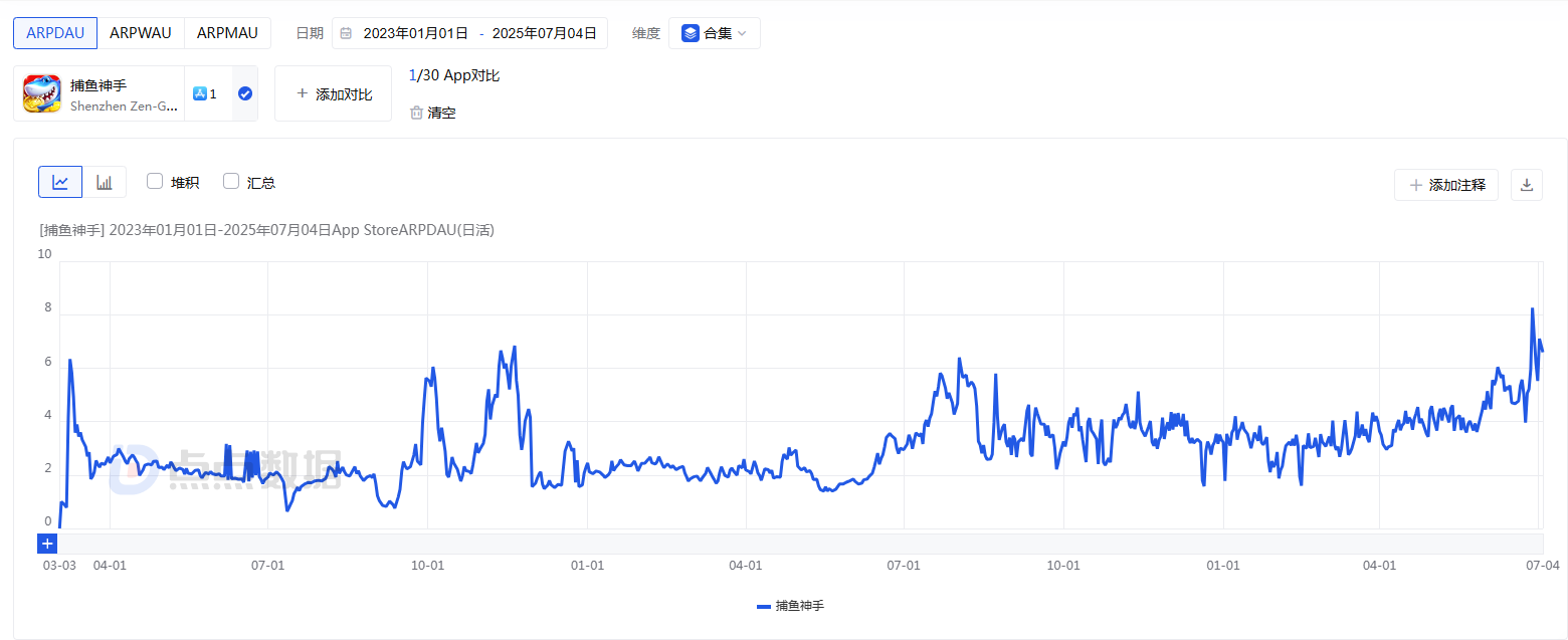 值得注意的是,《捕鱼神手》的ARPDAU(日收入/日活)近期也创下上市以来新高,表明用户具有较强的付费能力与付费意愿。