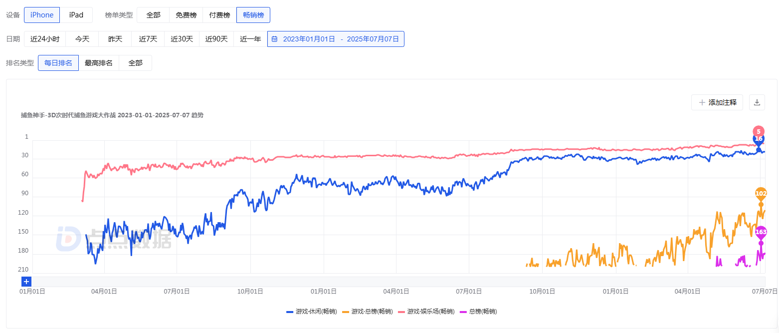 公开资料显示,《捕鱼神手》是一款2023年上线的休闲游戏,上线之初表现较为平淡。但上线以来,《捕鱼神手》的免费榜和畅销榜排名持续走高。