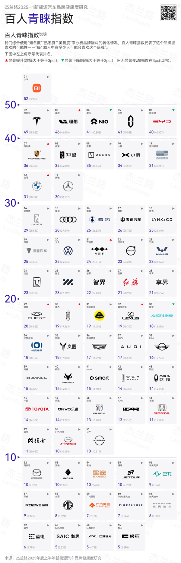 快科技7月7日消息,杰兰路今日发布了2025年度上半年新能源汽车品牌健康度研究。调研覆盖了65个新能源汽车品牌,询问超过8,200名新能源车主用户的意见。