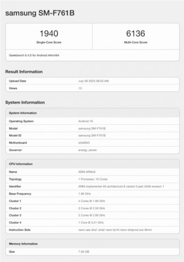 在性能测试中,Galaxy Z Flip7 FE单核得分为1940,多核得分为6136,单核多核性能均低于高通2023年发布的骁龙8 Gen3移动平台。