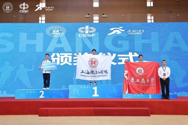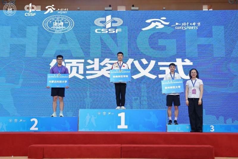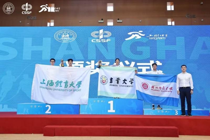 ↑上海财经大学体育教学部副主任董敏凯(右一)为运动员颁奖并合影