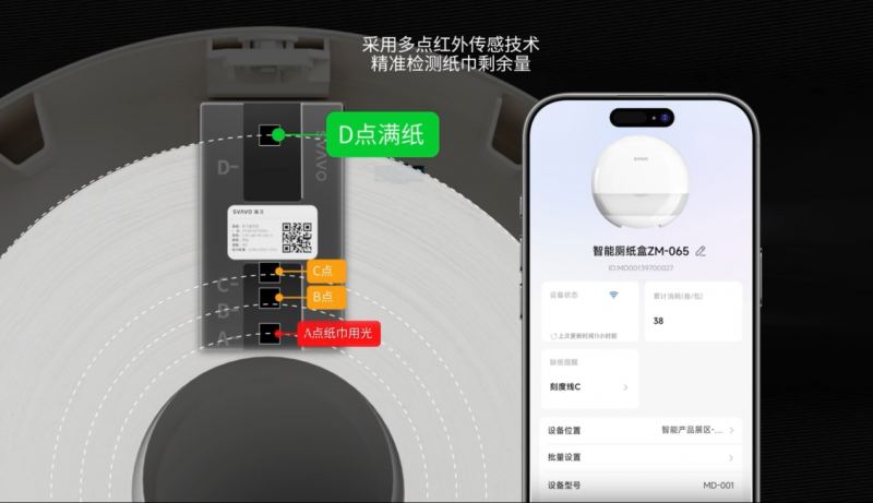 真正有用的技术,不在“新”,而在“稳”。SVAVO瑞沃自研多点红外纸巾传感器,具备高精度、低功耗、广适配等核心特性,可精准识别纸巾余量变化,实现24小时稳定监测。设备即装即用,1年满电续航,适配多种纸巾盒,真正实现“部署即上线,运行即稳定”。