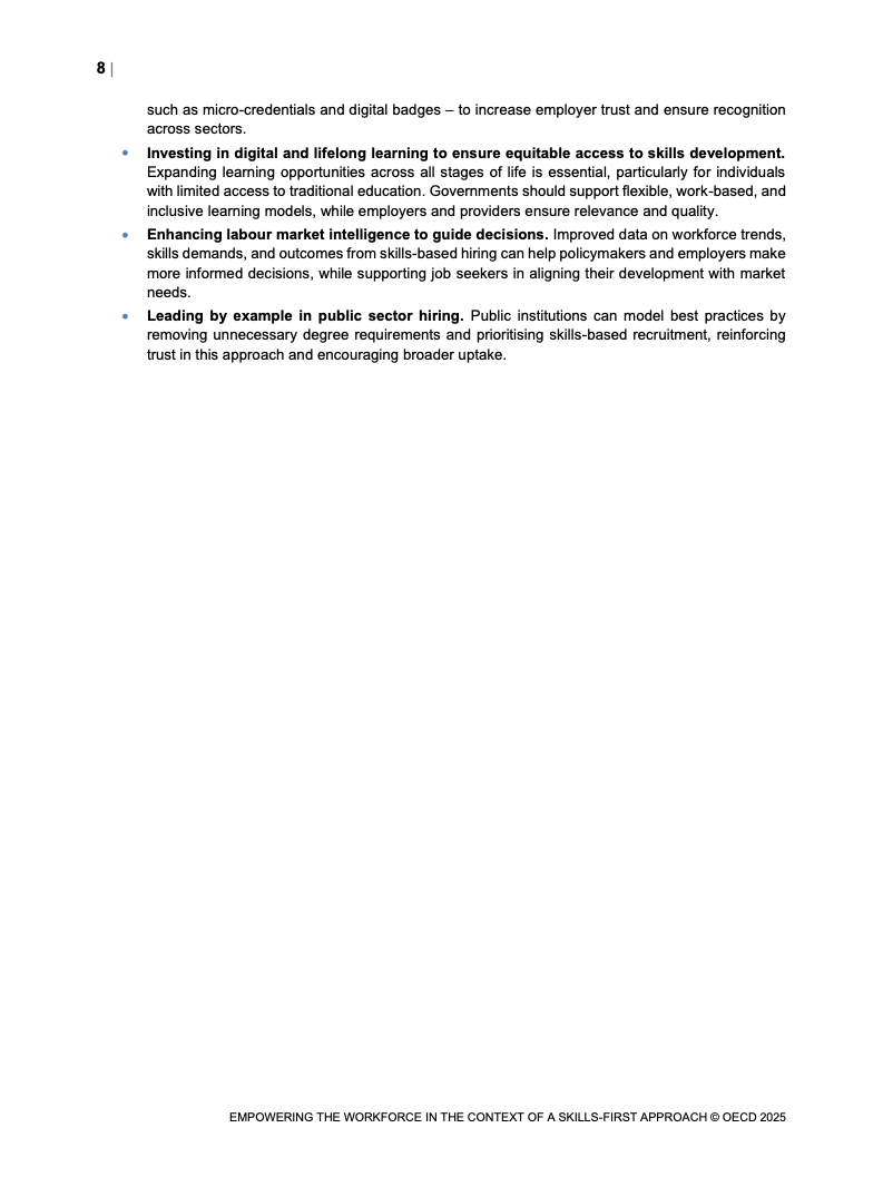 公共政策应支持标准化技能验证与终身学习。 投资劳动力市场情报,并推动公共部门率先采纳。 此举旨在改善个体就业机会,促进经济增长。 同时提升国家竞争力,赋能劳动力转型。