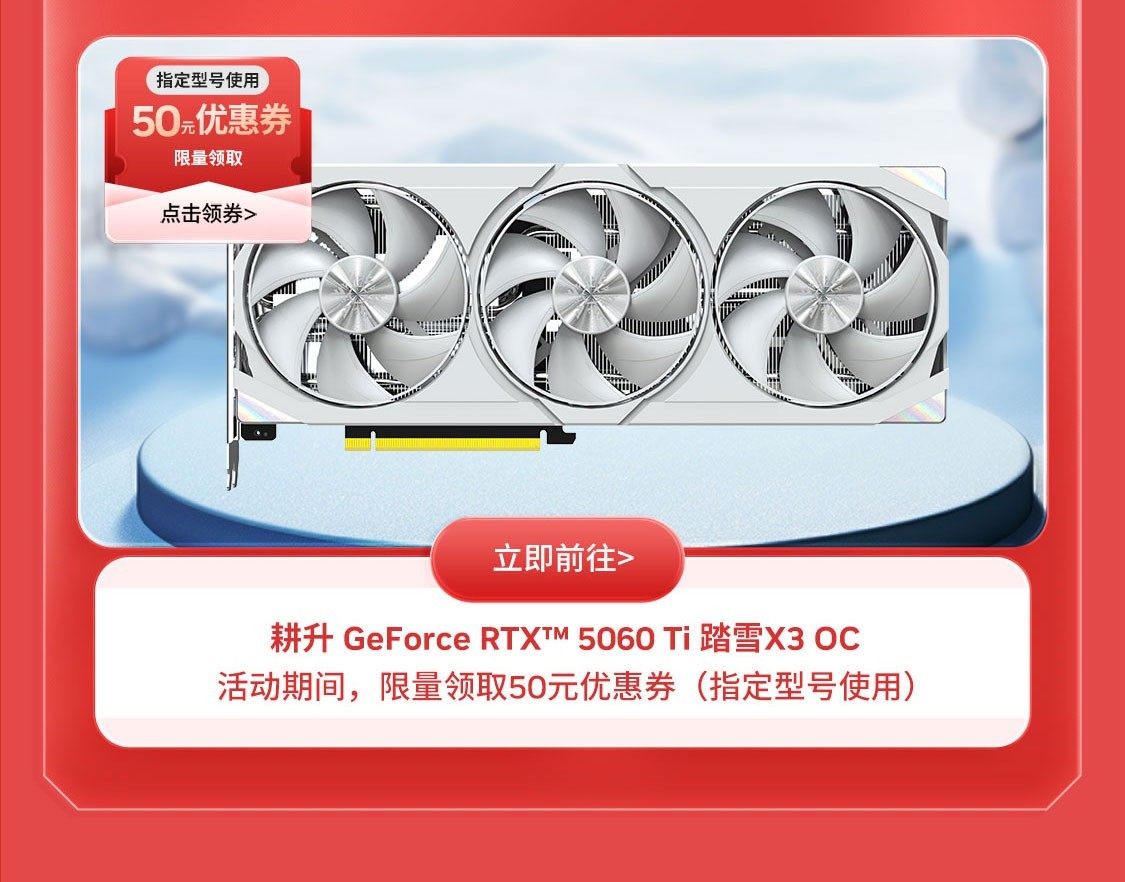 在此次活动中,用户还可前往店铺领取50元立减优惠券,购买指定型号耕升GeForceRTX 5060Ti 踏雪X3OC 即可享受50元立减优惠。(数量有限,先到先得哦!)