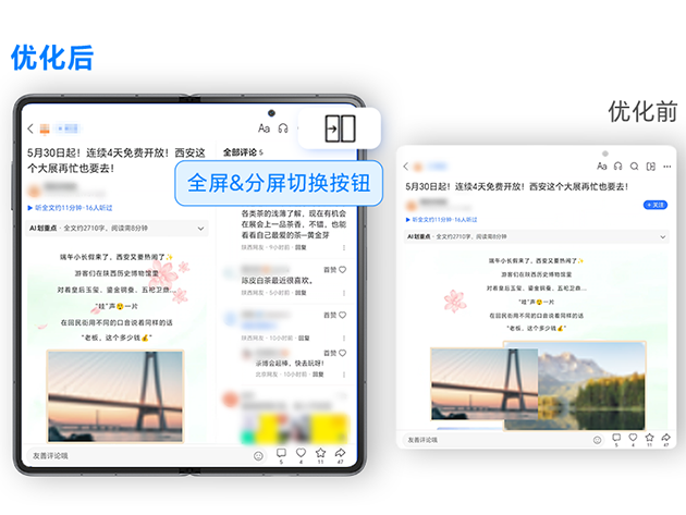 腾讯新闻APP为荣耀折叠屏定向开发的“一键分屏”功能,为用户带来了「边阅读边互动」的升级体验——左屏看新闻,右屏看相关热门评论,即时转评赞,实现内容与交互的双重兼顾。用户亦可根据自己的需求便捷切换大屏和分屏模式,提供更多个性化选择。