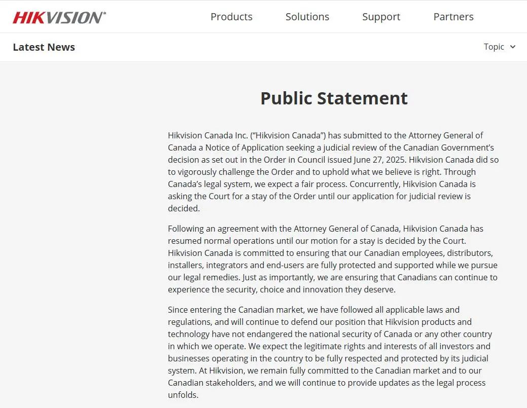 海康威视在声明中重申,自进入加拿大市场以来始终严格遵守当地法律法规,并坚信其产品与技术不会对包括加拿大在内的任何国家的国家安全构成威胁。该公司还强调,期望所有在该国经营的投资方和企业的合法权益得到充分尊重和保护,由其司法系统提供保障。