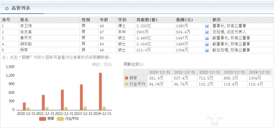 通过整理历年财报可以得知,副总经理杨军2020年年薪为261.9万元,2021年为527.4万元,2022年为712.5万元,2023年为895.3万元,2024年年薪则增长到了1304万元,薪酬不仅持续四年上涨且涨薪幅度较大,累计增长1042.1万元。