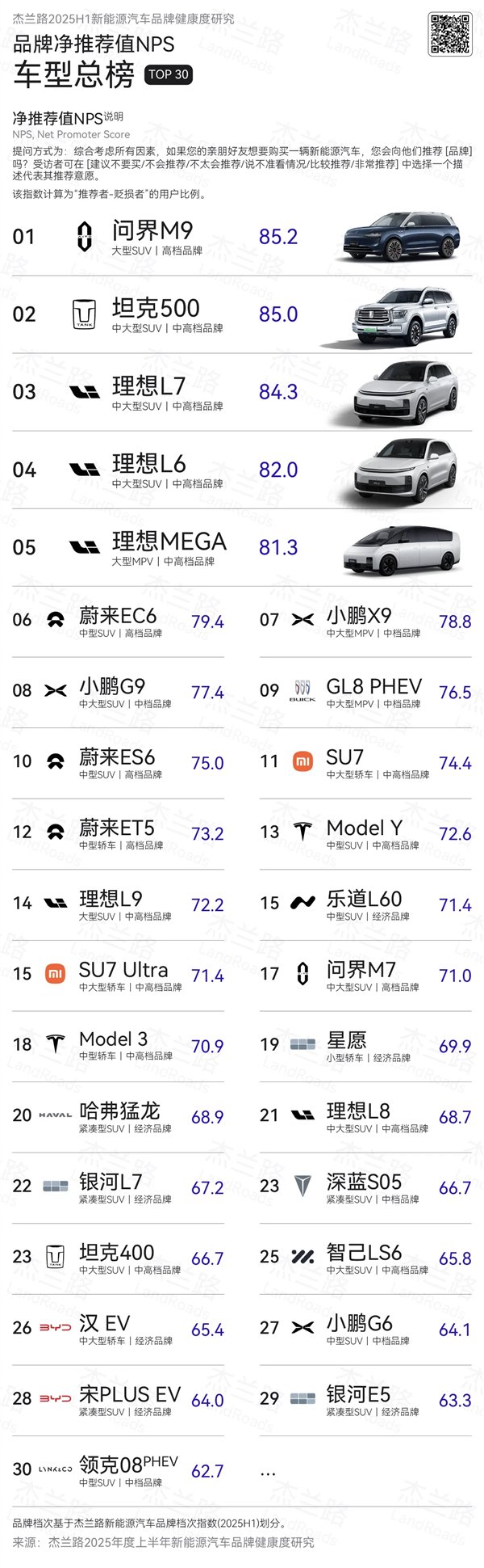 就在今日,专注于汽车市场数据研究与咨询服务的专业机构“杰兰路”发布了《杰兰路2025年度上半年新能源汽车品牌健康度研究(NPS篇)》的调研报告。