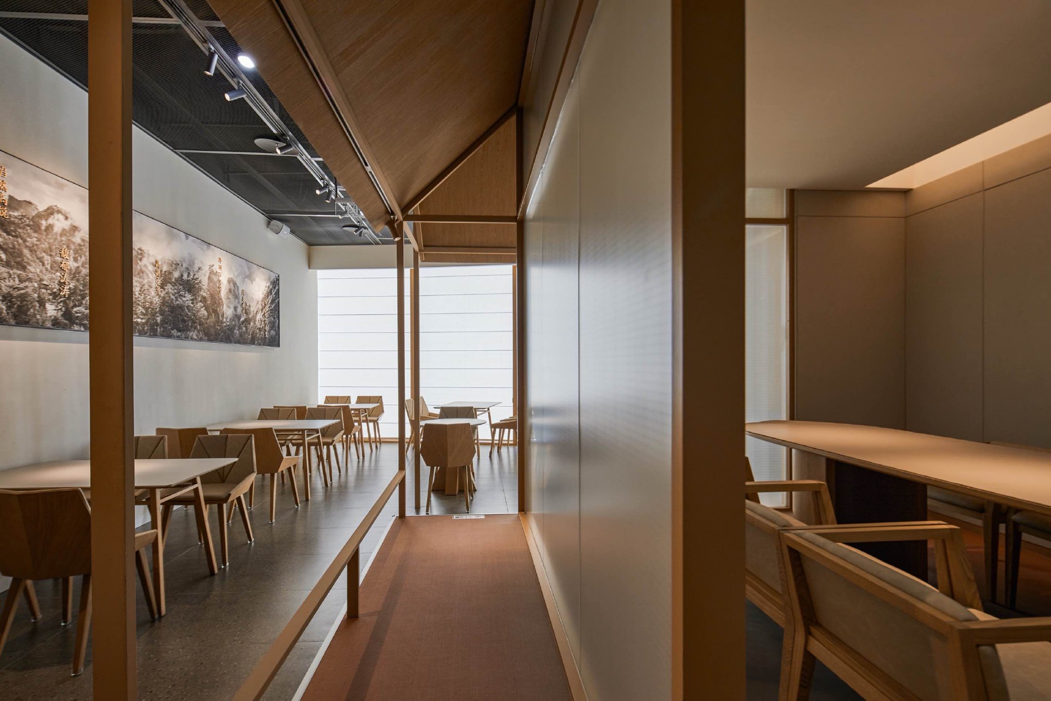 远观tea'stone的门店,装修以新中式风为主,梁柱上投射百种茶名,楼阁元素与光影交错。从门店动线来看,进门先是零售区,左侧为茶具展览售卖区,摆放品牌原创设计的茶器与茶叶礼盒,右侧往里是堂食点餐区,可选择茶水与茶点,茶水价格在38元-168元不等。茶饮区整体为开放式,有散座、半开放式茶寮以及更为私密的小包间,注重打造“星巴克”式的第三空间。