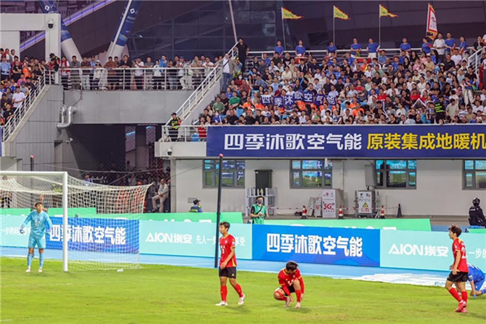 而淮安VS连云港的比赛现场,四季沐歌空气能品牌标识与全场沸腾的激情一同被镜头捕捉,成为当之无愧的“C位”焦点。