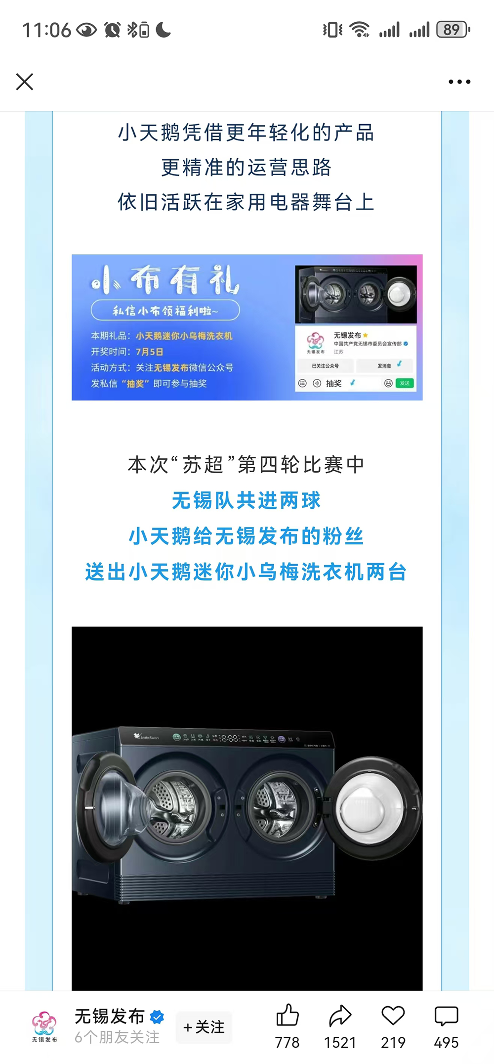 与此同时,小天鹅更是将“城市主队绑定”策略玩得出彩。作为无锡本地品牌,小天鹅主动认领无锡队为“主队”,并联合“无锡发布”送出迷你洗衣机作为球迷福利。更在第五轮比赛中推出“常州队每进一球,抽奖送哆啦A梦联名款迷你洗衣机”的活动,精准点燃球迷的参与热情。