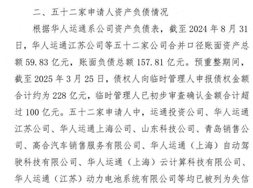 资产和负债情况方面,华人运通系五十二家公司合并口径账面资产总额为59.83亿元,账面负债157.81亿元。同时,在预重整期间,债权人申报债权金额合计约228亿元,临时管理人已初步审查确认的债权金额合计超过100亿元。