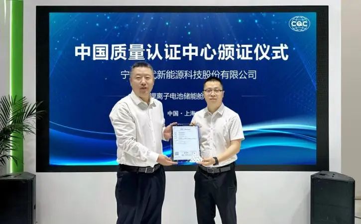 6月12日,上海SNEC PV+国际太阳能光伏和智慧能源&储能及电池技术与装备大会现场,宁德时代5MWh EnerD液冷储能系统获中国质量认证中心(CQC)颁发的国内首张储能系统产品认证证书。此次为行业首张储能系统国标认证证书的颁发,标志着宁德时代储能产品在电气安全、环境适应性及热失控风险控制等维度已达国内领先水平。
