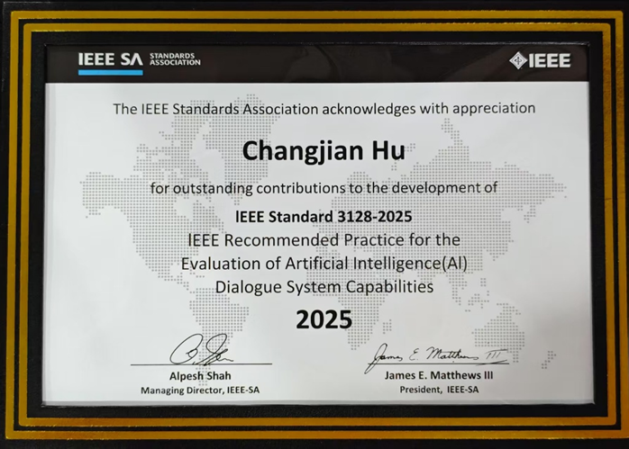 近日,IEEE SA(国际电气电子工程师学会标准协会)向诺谛智能创始人兼CEO胡长建博士颁发证书,感谢他在全球首个AI对话系统国际标准中所做出的杰出贡献。此前,由诺谛智能联合联想集团发起和深度参与的AI对话系统国际标准IEEE P3128-Recommended Practice for the Evaluation of Artificial Inteligence(Al)Dialogue System Capabiities已正式发布,胡长建博士为标准重要贡献者。