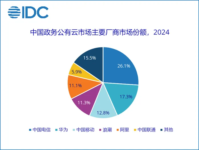 政务公有云市场来看,中国电信以26.1%领跑,华为、中国移动分居二三位。