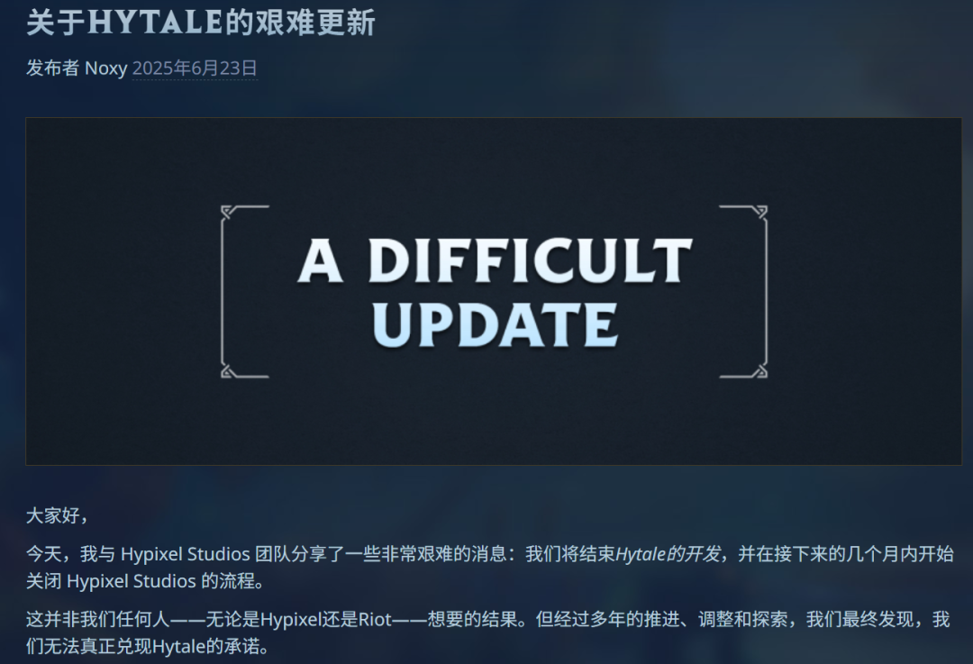 然而十年过去,6月24日,拳头游戏确认关闭Hypixel工作室,并彻底终止了《Hytale》的开发工作——整整十年时间,Hypixel团队没能发布任何实质成果,《Hytale》成了“只存在于想象中的游戏”。