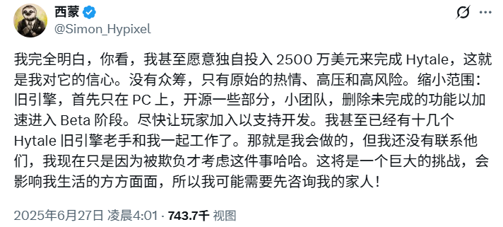 实际谁也说不清西蒙愿意回购项目的动机,毕竟《Hytale》的亏损让顶流公司都开始退步,整个项目成为了名副其实的烂摊子,而西蒙愿意凭一己之力接手,几乎远超“情怀”或是“热情”的范畴。