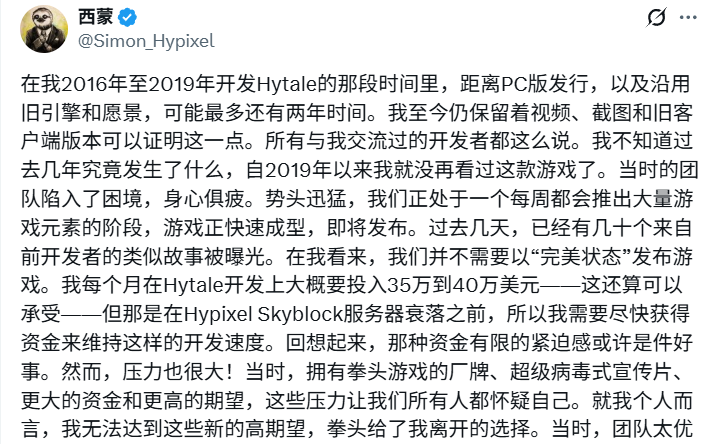 按照西蒙的描述,在团队被拳头收购之后,《Hytale》的开支和人们对项目的期望开始愈发膨胀,一切让他有些难以承受,最终他选择了离开团队。