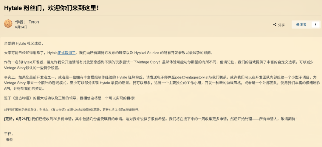 但对于那些苦等多年的玩家来说,这样的机会确实可遇不可求,为此人们也在网上发起了#SaveHytale的呼声,希望拳头游戏能对这个项目“网开一面”,至少能和西蒙先聊聊。
