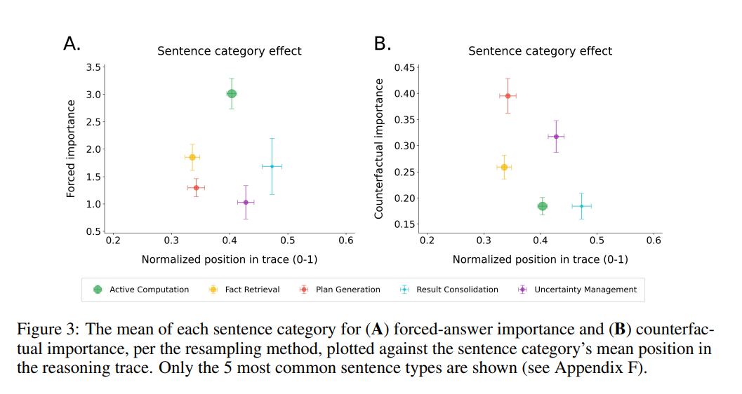 在数据集中,他们发现规划生成(Plan generation)和不确定性管理(uncertainty management)例如,回溯)句子的反事实重要性始终高于其他类别的句子,如事实检索或主动计算(见图 3B)。这支持了这样一种观点:高层次的组织性句子可以锚定、组织并引导推理轨迹。作者认为,与强制回答重要性和先前基于 token 或注意力的度量相比,这种方法提供了更有信息量的结果。