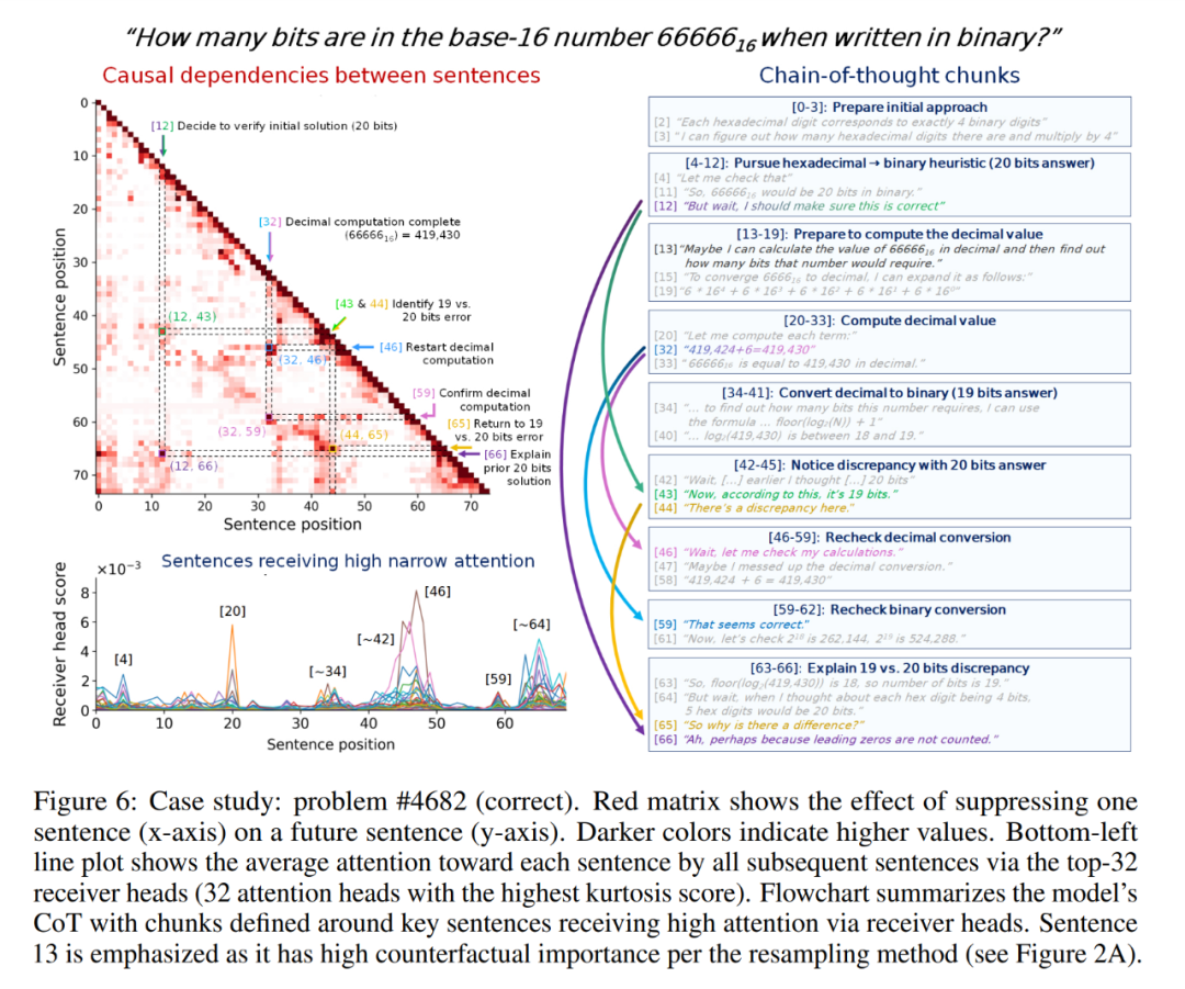 上述过程基于作者对注意力模式的分析:接收头精准定位了发起计算或陈述关键结论的句子,从而将推理轨迹划分为具有明确意义的模块(图 6)。