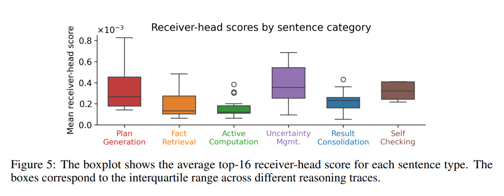 图 5 表明,规划生成、不确定性管理和自我检查(self checking)句子始终通过接收头获得最多的关注(见图 5),而主动计算句子获得的关注最少。进一步与这一发现一致的是,根据重采样方法,那些获得高接收头关注的句子往往也会对下游句子产生更大的影响。这些发现与以下观点相符:推理轨迹是围绕高层句子构建的 —— 这些句子启动的计算可能连接高层陈述,但对整体推理路径的影响可能微乎其微。