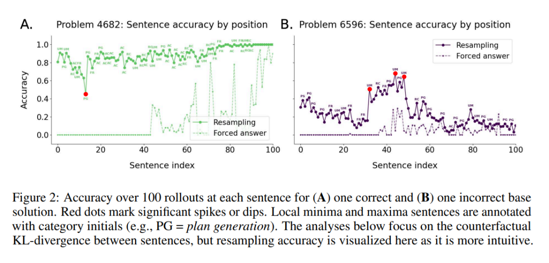 重采样方法揭示了这一初始错误轨迹和关键转折点(图 2A 已展示)。具体表现为:第 6-12 句期间预期准确率持续下降,但第 13 句使反事实准确率急剧上升。值得注意的是,若采用强制模型立即生成响应的评估方法(如部分已有研究所示),则会完全错过第 13 句的关键作用 —— 该方法仅会得到 0 准确率。
