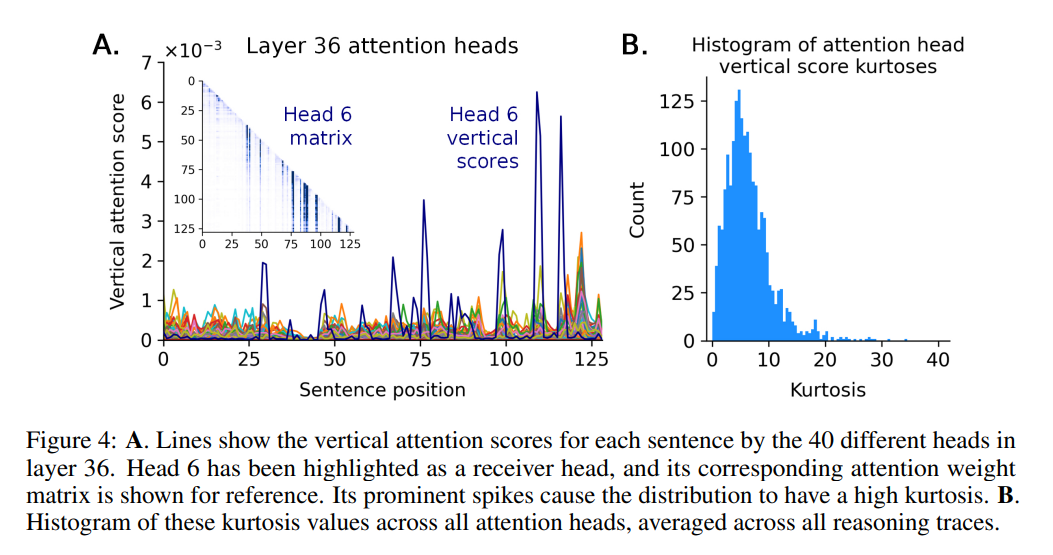 作者评估了不同的头在多大程度上将注意力集中在特定的句子上。首先,对于每个推理轨迹,他们将每个注意力头的 token-token 注意力权重矩阵取平均值,形成一个句子 - 句子矩阵,其中每个元素是两个句子之间所有 token 对的平均值。基于每个注意力矩阵,他们计算其对角线下方列的平均值,以衡量每个句子从所有下游句子中获得的关注程度;只在相隔至少四个句子的句子对之间取平均值,以专注于远距离的连接。这为每个头生成了一个分布(例如,图 4A),并且每个头通常将注意力集中在特定句子上的程度可以通过其分布的峰度来量化(对每个推理轨迹进行计算,然后在轨迹之间取平均值)。绘制每个头的峰度图表明,一些注意力头强烈地将注意力集中在推理轨迹中特定的、可能是重要的句子上(图 4B)。