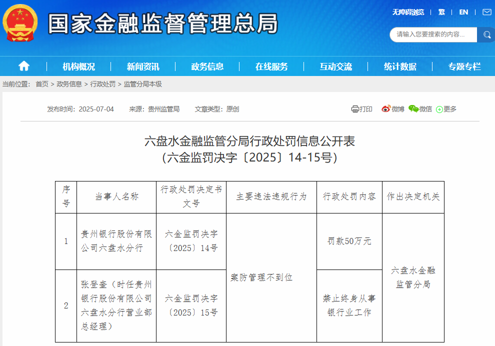 7月4日,贵州银行股份有限公司六盘水分行,因案防管理不到位,被六盘水金融监管分局处以罚款50万元。时任贵州银行股份有限公司六盘水分行营业部总经理张登奎,被禁止终身从事银行业工作。
