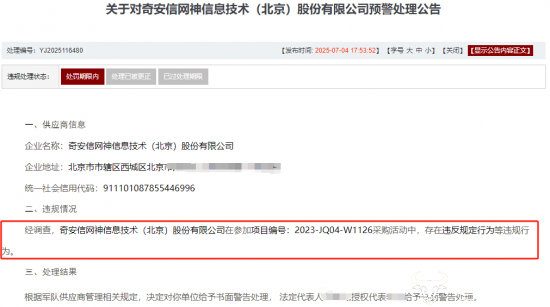 7月4日,某大系统采购网发布《关于对奇安信网神信息技术(北京)股份有限公司预警处理公告》,直指奇安信网神在某项目中存在违规行为。