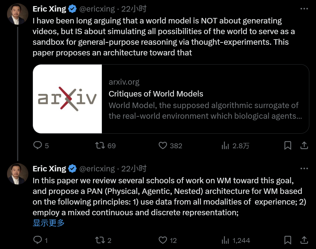 研究者表示,PAN 世界模型的详细信息及结果会很快在另一篇论文中展示。MBZUAI 校长、CMU 教授邢波在论文提交后转推了这篇论文,并表示 PAN 模型即将发布 27B 的第一版,这将是第一个可运行的通用世界模拟器。