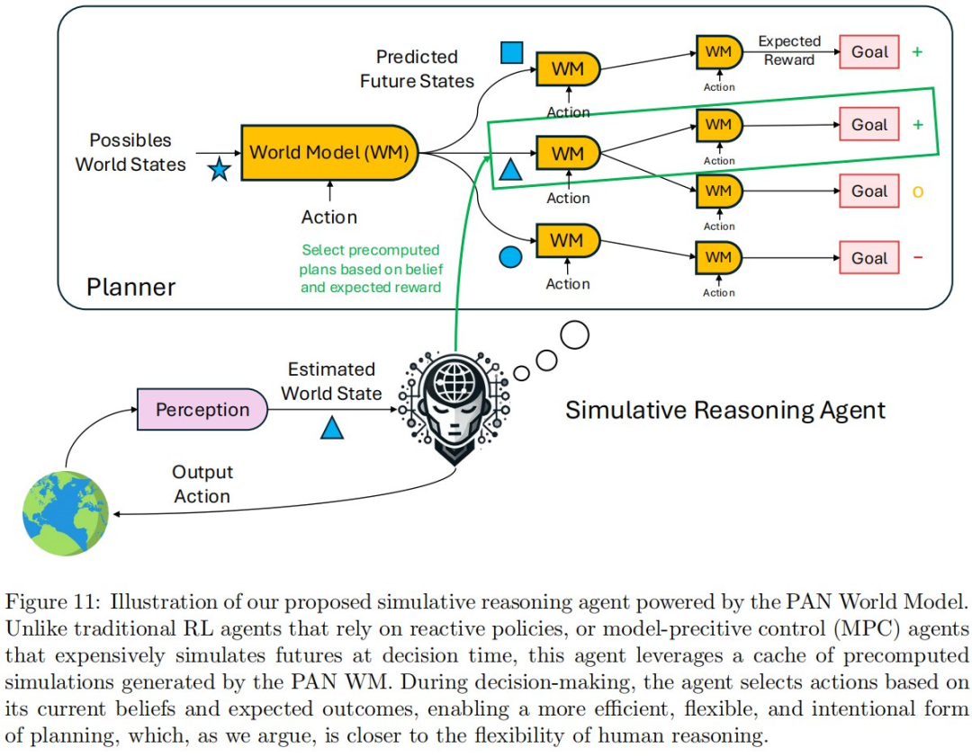 作者概述了一种利用世界模型进行模拟推理的智能体架构。PAN 自然地融入这一范式,不仅作为视频生成器,更作为一个丰富的内部沙盒,用于模拟、实验和预见未来。