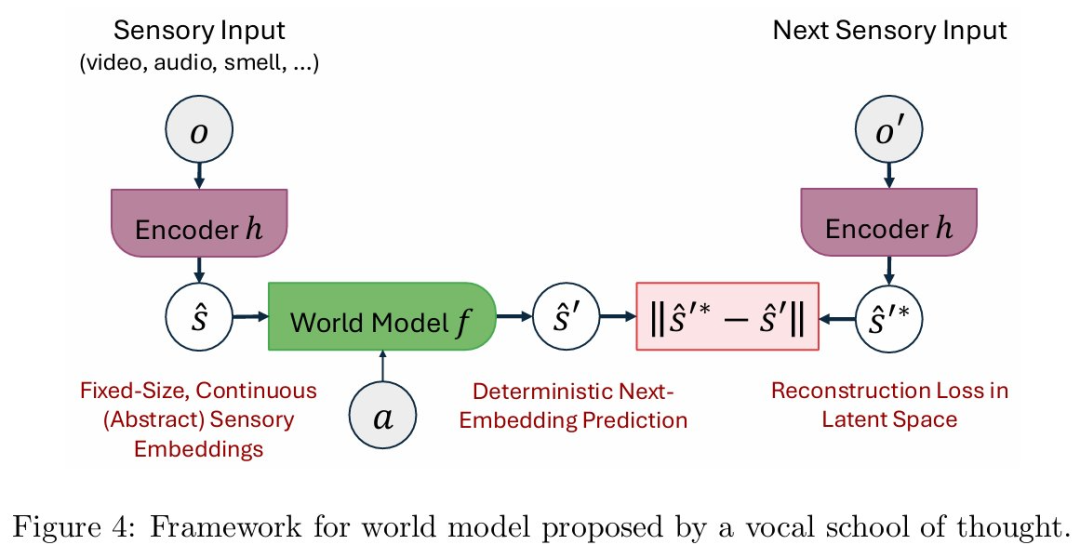 该学派还为世界模型提出了如图 4 所示的替代框架,其核心思想可以概括为「预测下一个表征」,而非「预测下一个数据」: