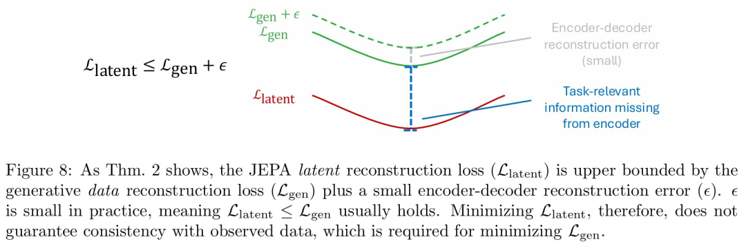图 8 进一步从理论上解释了,潜在空间损失只是生成式损失的一个宽松的「上界代理」 。这意味着,即使一个模型的潜在损失很低,也不能保证它在真实世界中的预测是准确的,因为它可能遗漏了对任务至关重要的信息 。