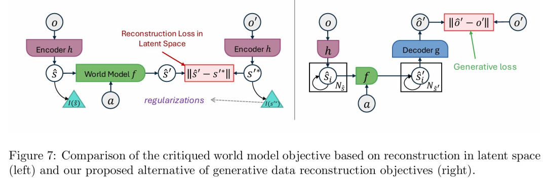 如论文图 6(左半部分)所示,这种被批判的「编码器 - 编码器架构」在潜在空间中进行「确定性的下一嵌入预测」 ,但它在功能上仍是自回归的,需要递归地预测未来状态,因此并未真正避免其声称要解决的误差累积问题 。更关键的是,通过移除解码器来避免重构观察数据,会导致模型学习到的潜在表示与真实世界脱节,难以诊断,甚至可能崩溃到无意义的解 。