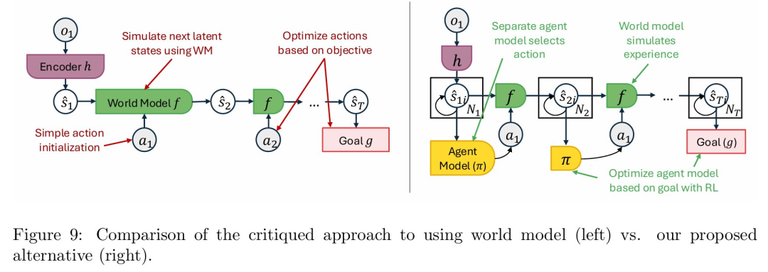 如论文图 9(左半部分)所示,MPC 在决策时需要反复进行「模拟下一个潜在状态」和「基于目标优化动作」的循环 ,这导致其计算开销巨大,难以应对快速变化的环境,并且通常视野有限,难以进行长时程战略规划 。