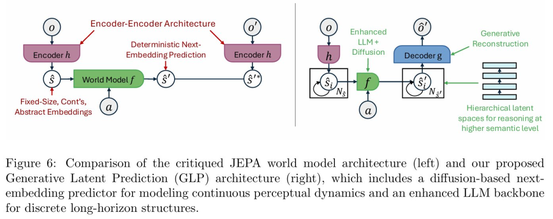 更好的方案不是抛弃生成模型,而是采用分层的生成式潜在预测(GLP)架构,这在图 6(右半部分)中得到了展示 。该架构包含一个解码器用于「生成式重构」 ,其核心是一个由「增强的 LLM + 扩散模型」构成的分层世界模型 。这种设计既能通过生成式解码器确保模型与真实数据挂钩,又能通过分层抽象来隔离底层噪声,实现更鲁棒、更强大的推理 。
