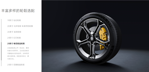 -21英寸花瓣、21英寸梅花两款锻造轮毂,兼顾轻量化与高强度,还配备悬浮车标,彰显豪华感。