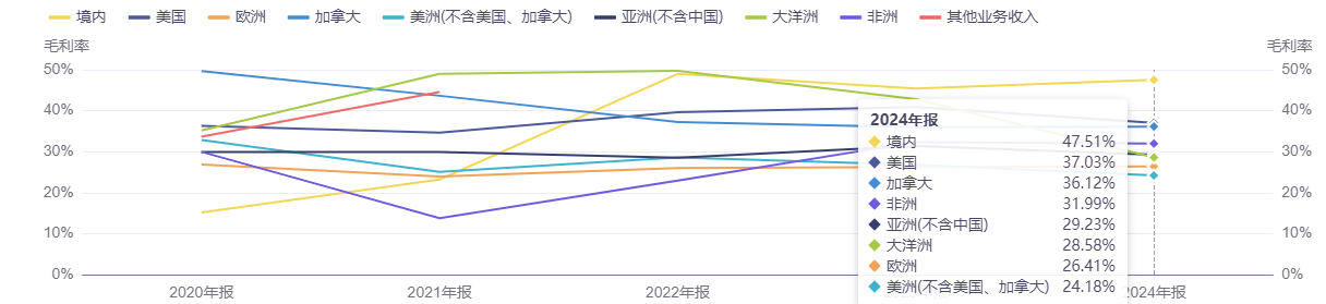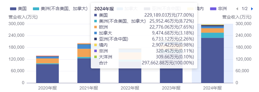 目前,北美已经成为涛涛车业最大的市场,为公司贡献了超八成的收入。其中,美国是唯一超级市场,2024年实现收入22.92亿元,占比2023年的71.32%升至77%。