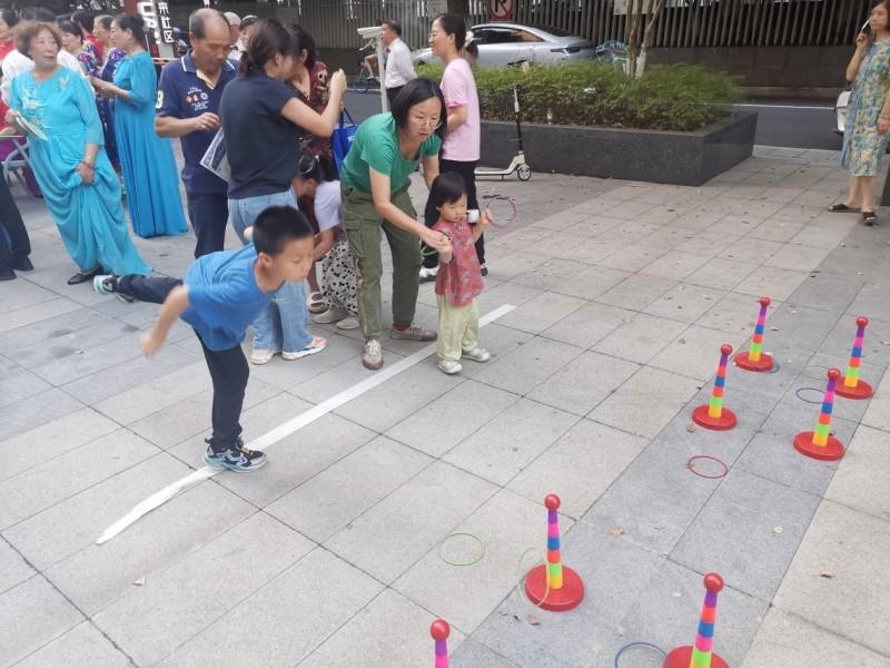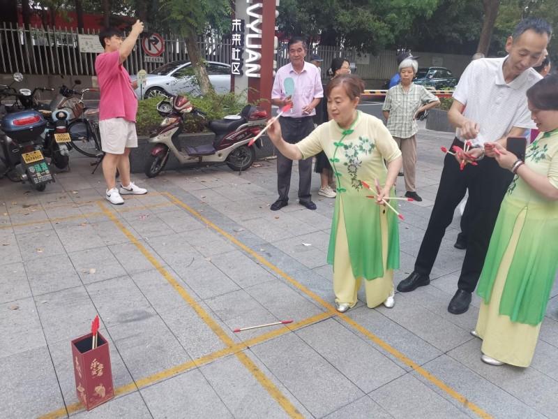 成功答题的居民随即可参加妙趣横生的传统游戏赢取奖品。套圈游戏中,居民们凭借精准的投掷技巧赢取心仪奖品;而投壶游戏作为传统民俗活动,盛行于宋代,演变至今更添市井欢乐,投中者即可获得一份新鲜蔬菜。一时间,活动现场居民络绎不绝,欢声笑语回荡在整个社区。