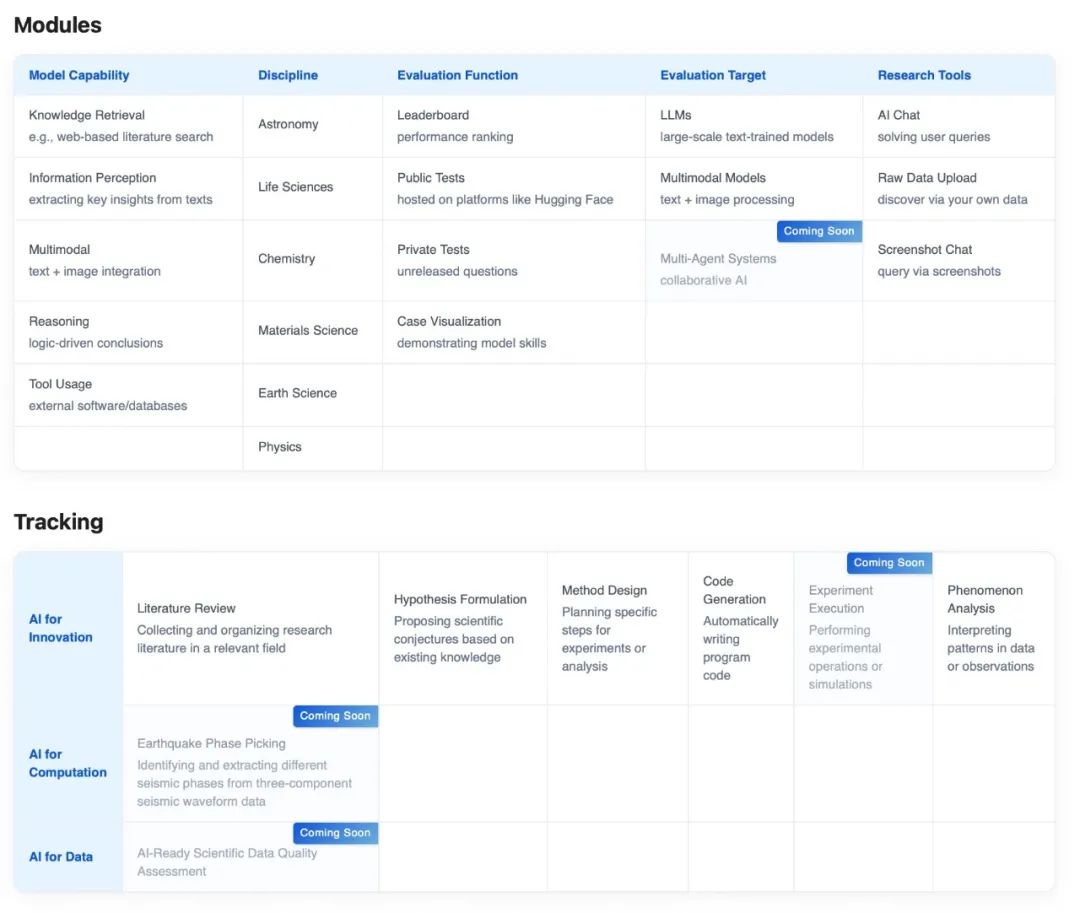 除发布了 SFE 评测基准之外,研究团队还构建了「棱镜」(SciPrismaX) 科学评测平台。平台包含了模型能力、学科多样性、评估策略、评估对象与评估工具五大模块,覆盖了 AI for Innovation、AI for computation 和 AI for Data 三层评估维度,致力于构建更严谨、动态且与科研实践深度契合的评估生态。