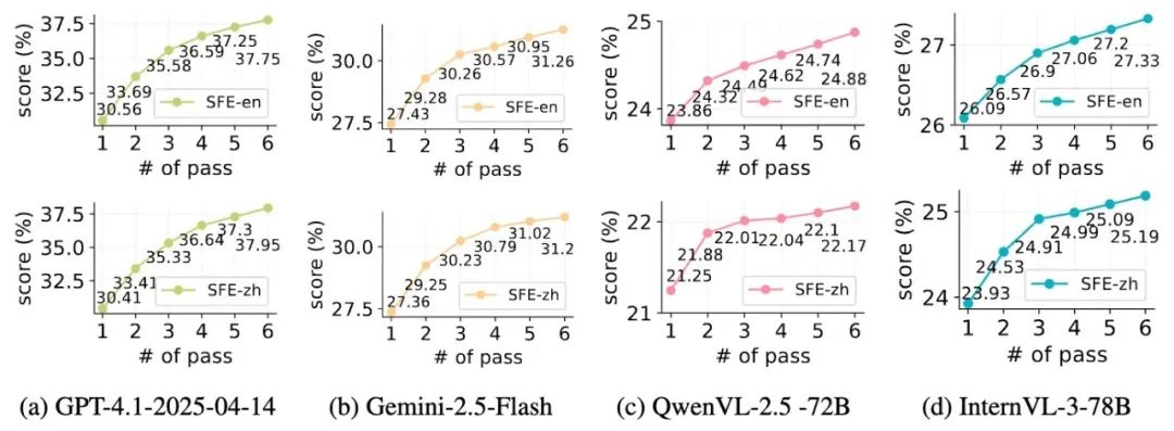 采用 Pass@k 指标评估模型生成高质量答案的能力,结果显示,闭源模型(如 GPT-4.1-2025-04-14 和 Gemini-2.5-Flash)不仅初始表现更好(30.56% vs 26.09%),而且随着 k 增加,性能提升也更明显(30.56% → 37.75% vs 26.09% → 27.33%)。