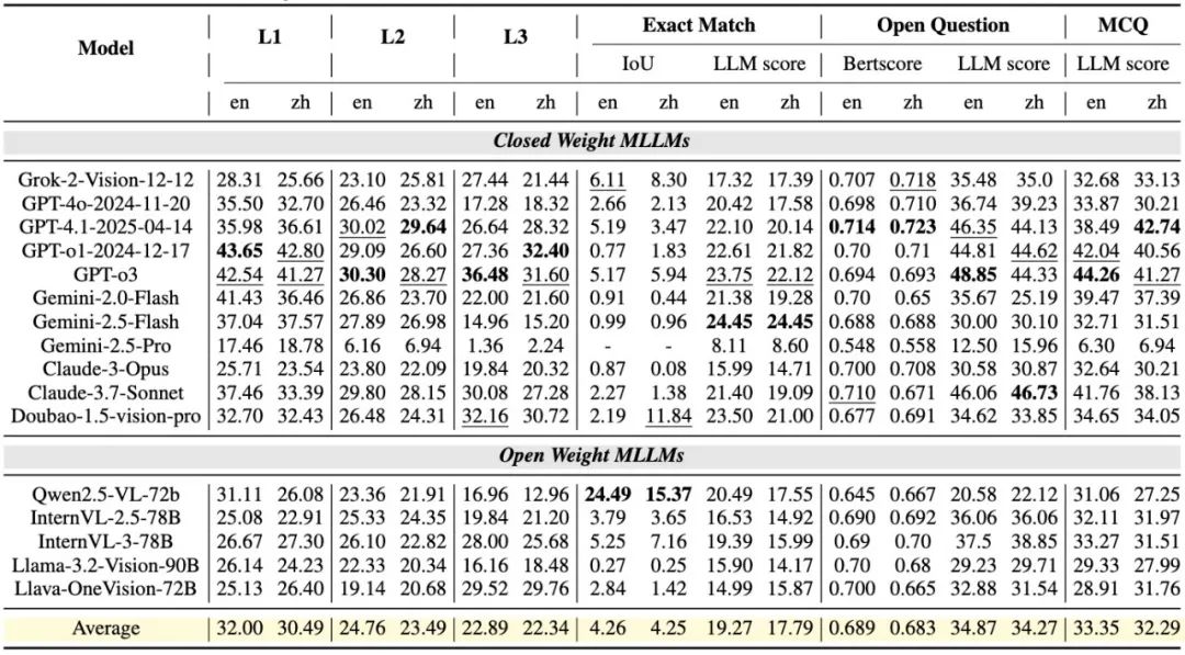 评测结果显示,材料科学是各类模型表现最好的领域,GPT-o3 在该方向的英文任务中达到 63.44%,中文任务为 58.20%,即便是开源模型(如 Qwen2.5-VL-72b、InternVL-3-78B)也能超过 40%。这种优势主要得益于材料科学任务的输入结构化明显(如相图、X 射线衍射图),模型可依赖其较强的符号化视觉信息处理能力,输出结构化的科学答案。