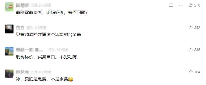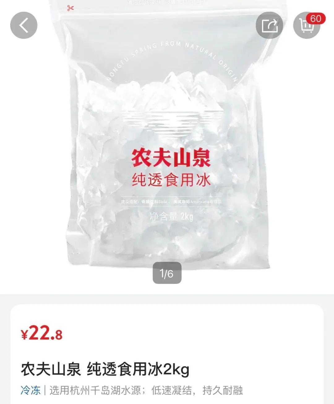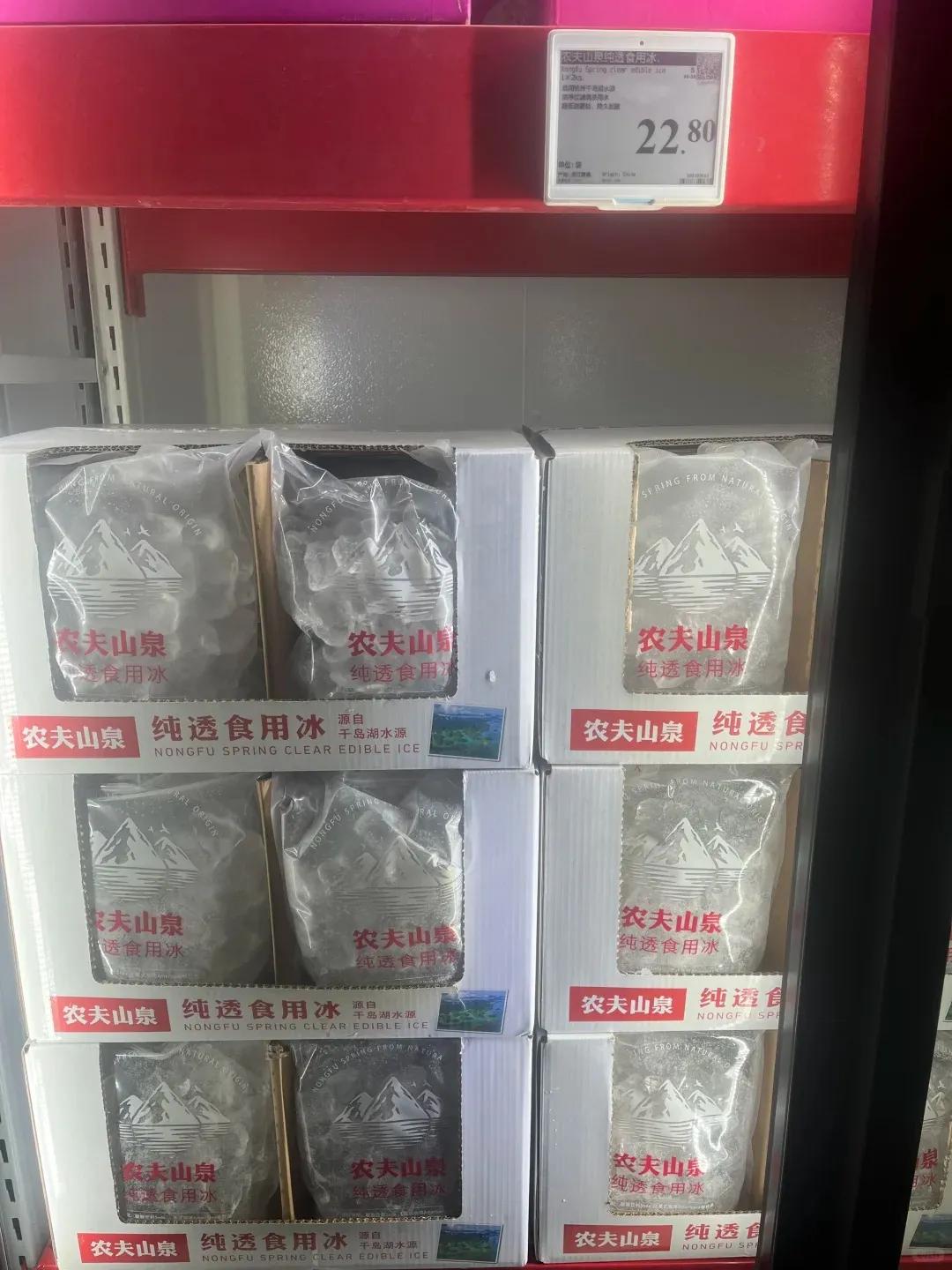 换算一下:冻出2公斤冰,理论上只需要4瓶500ml的农夫山泉瓶装水(市价约8元),如今卖到22.8元,等同于一瓶水要价5.7元,这可贵太多了。
