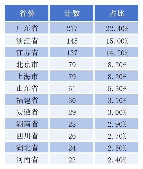 从地域分布看,根据省份划分,广东有217家,占比22.4%;浙江有145家,占比15.0%;江苏有137家,占比14.2%。