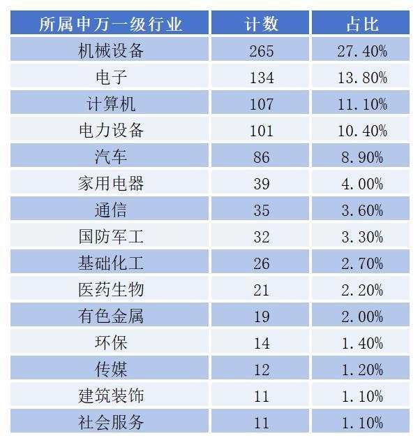从行业分布看,根据所属申万一级行业分类,机械设备有265家,占比27.4%;电子有134家,占比13.8%;计算机有107家,占比11.1%;电力设备有101家,占比10.4%。